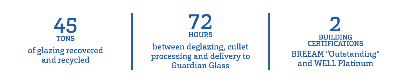 Společnost Guardian Glass spolupracovala se společnostmi Structura, Cfield Construction a May Glass Recycling na regeneraci a recyklaci 45 tun zasklení z Mountbatten House. Do 72 hodin po odborném vytěžení první zasklívací jednotky společností Structura bylo sklo přepraveno do zařízení May Glass Recycling, kde bylo vyčištěno, rozdrceno a roztříděno na střepy. Tyto střepy byly poté dodány do závodu Guardian Glass v Goole ve Velké Británii, poté roztaveny a přeměněny přidáním dalších panenských surovin do pece na nové plavené sklo.