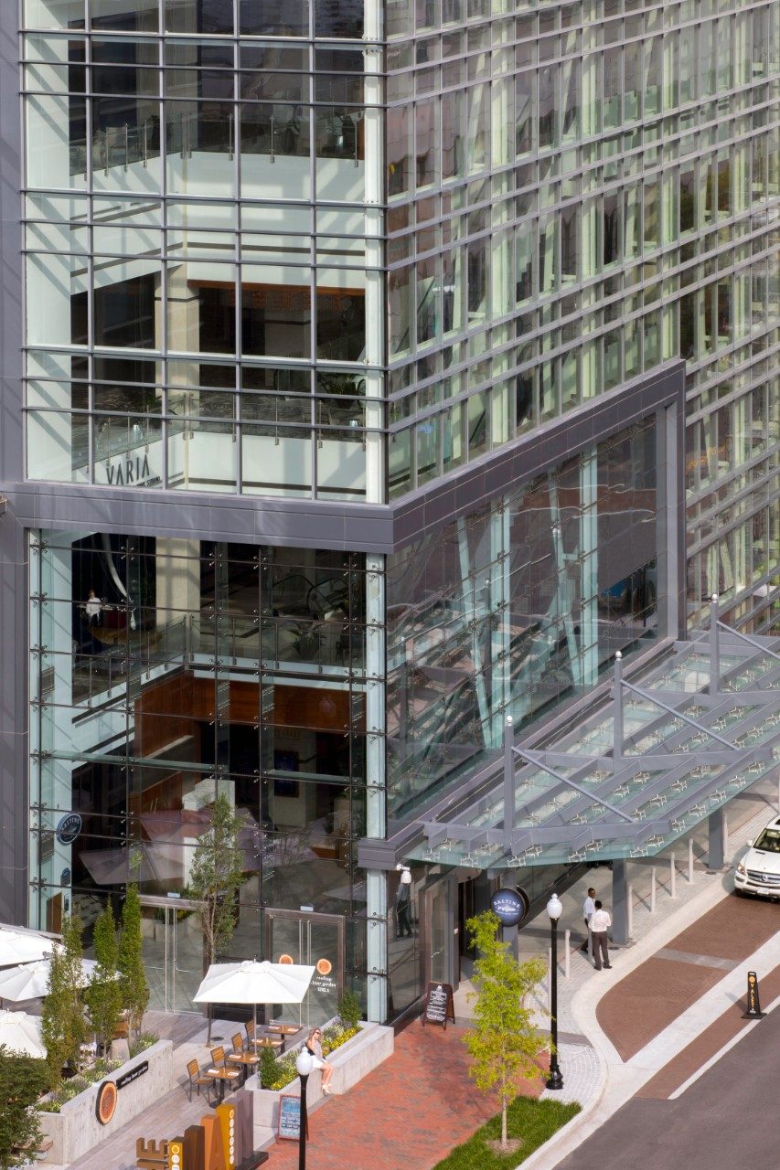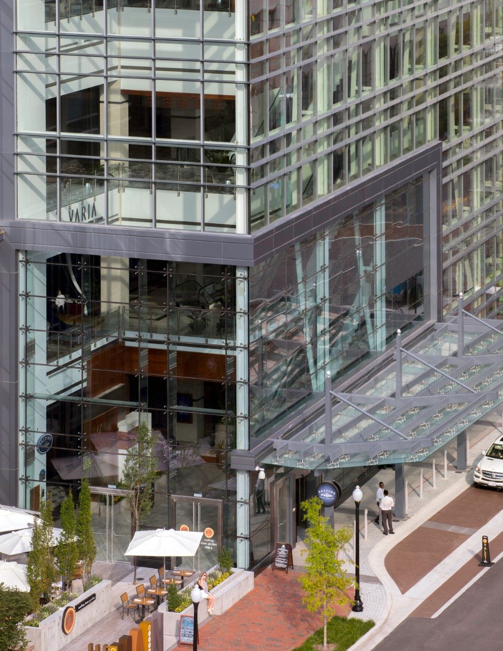 Die Ästhetik ist dank der raffinierten strukturellen Verglasung optisch ansprechend und spiegelt die Umgebung des Gebäudes auf allen Seiten wider.