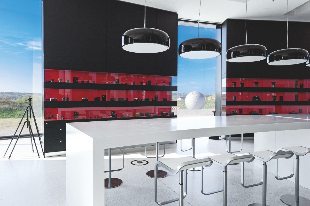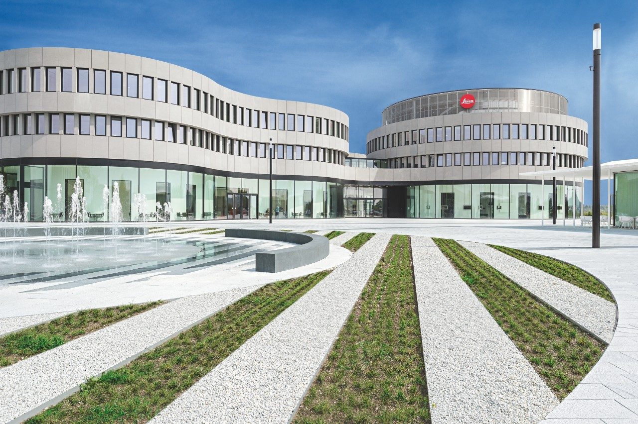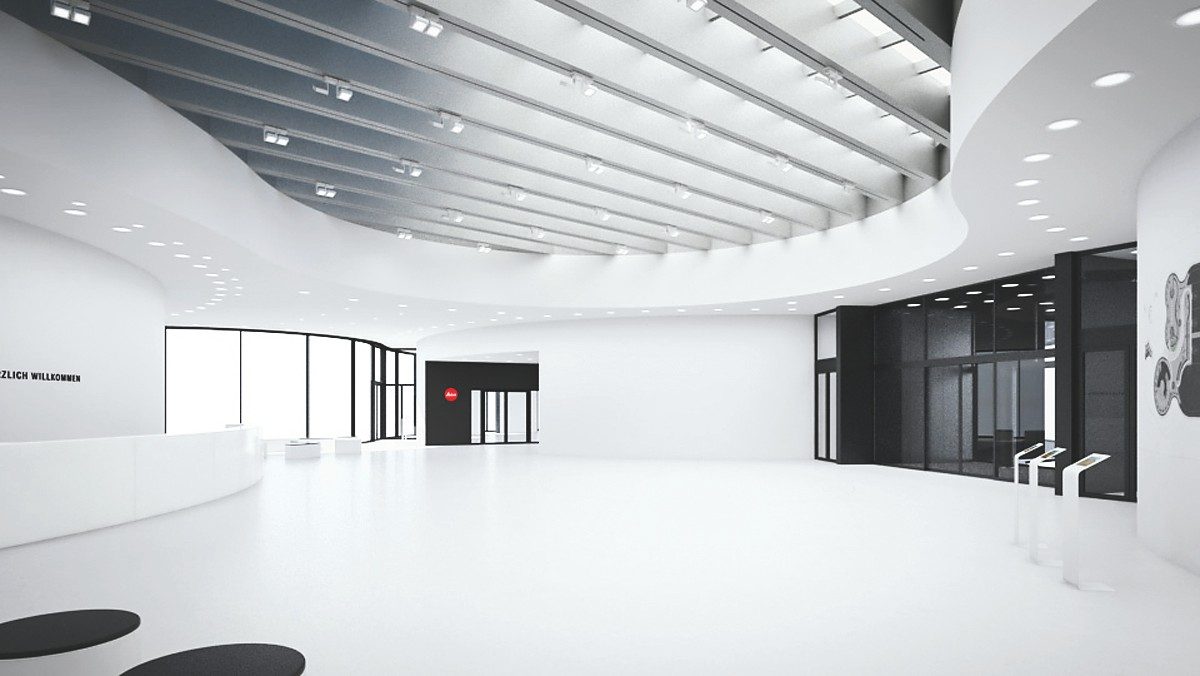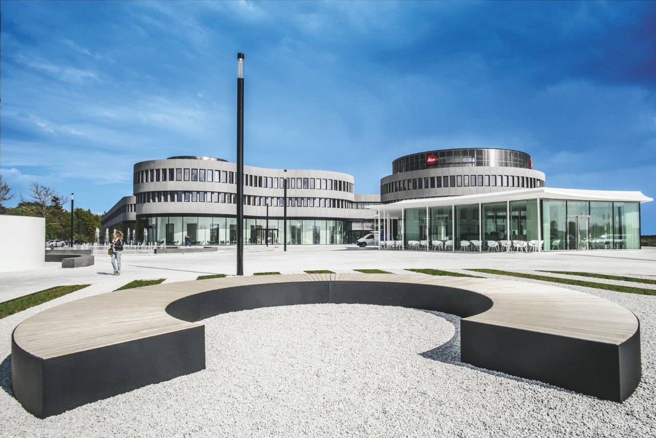 Die gebogene Fassade des Hauptquartiers ähnelt genau einer Reihe von Kameraobjektiven. Zwei zylindrische Strukturen bilden den Haupteingang zum Gebäude – die kreisförmigen Segmente setzen sich nach innen fort und ermöglichen eine automatische Assoziation mit den Leica Linsen und Ringprodukten.