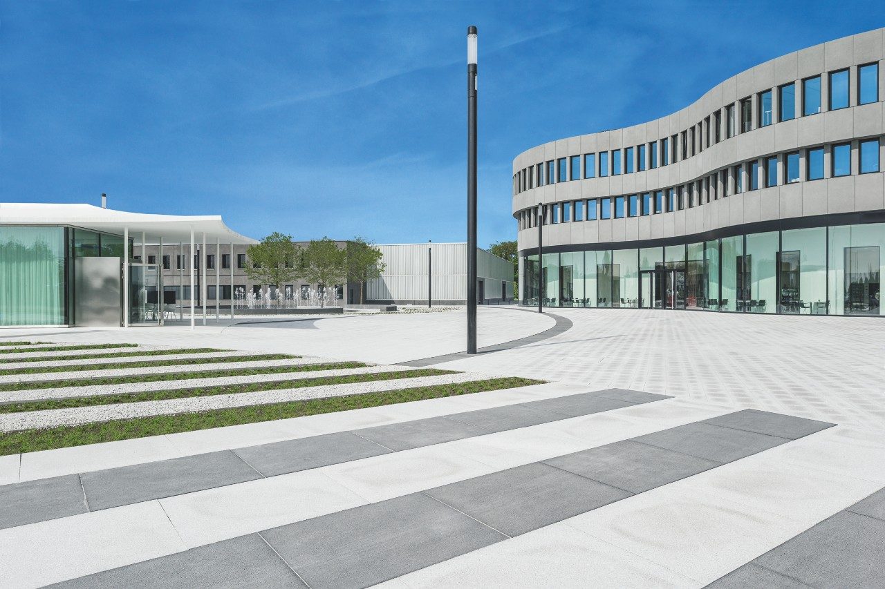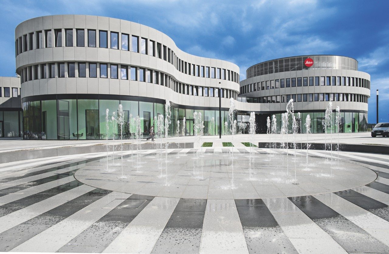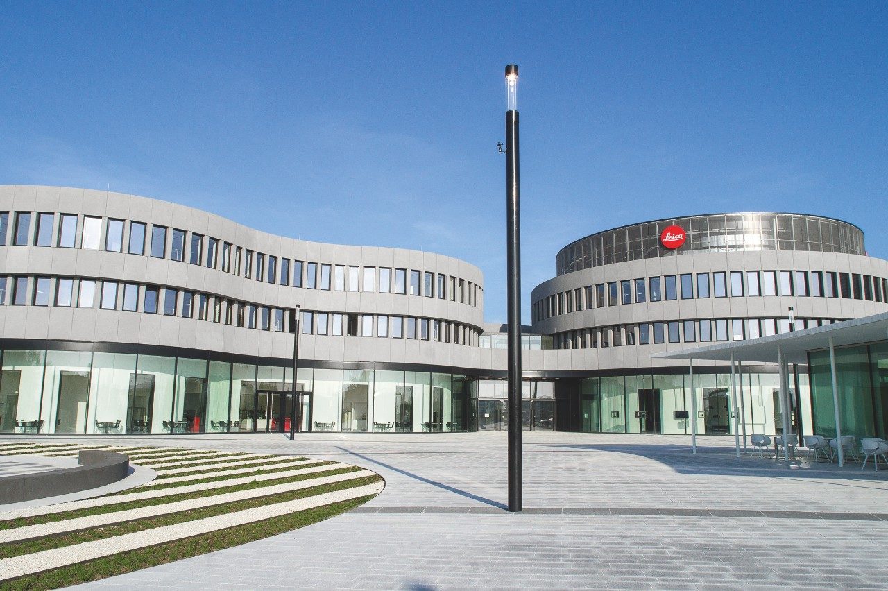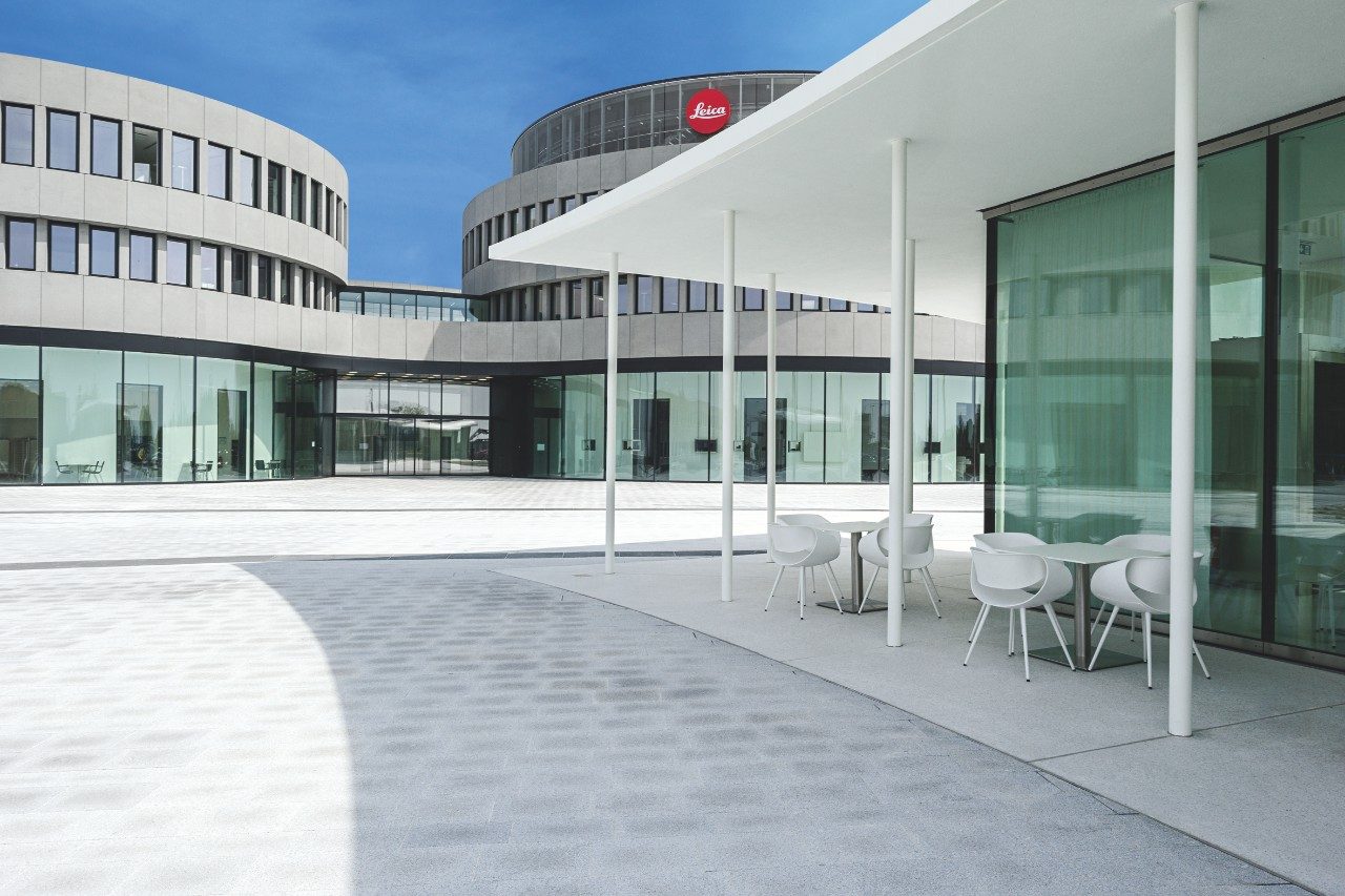 Die gebogene Fassade des Hauptquartiers ähnelt genau einer Reihe von Kameraobjektiven. Zwei zylindrische Strukturen bilden den Haupteingang zum Gebäude – die kreisförmigen Segmente setzen sich nach innen fort und ermöglichen eine automatische Assoziation mit den Leica Linsen und Ringprodukten.