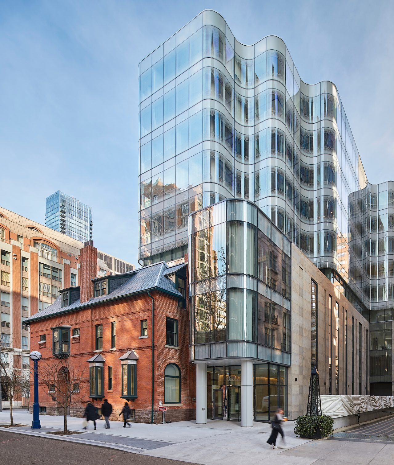 Die Lösung: Der geschwungene, sechsstöckige Turm besteht aus eisenarmem gebogenem Glas mit einem weißen Muster, das über die historischen Gebäude strömt, die sein Podium bilden, und bietet eine atemberaubende Ergänzung zu den bestehenden Fassaden.