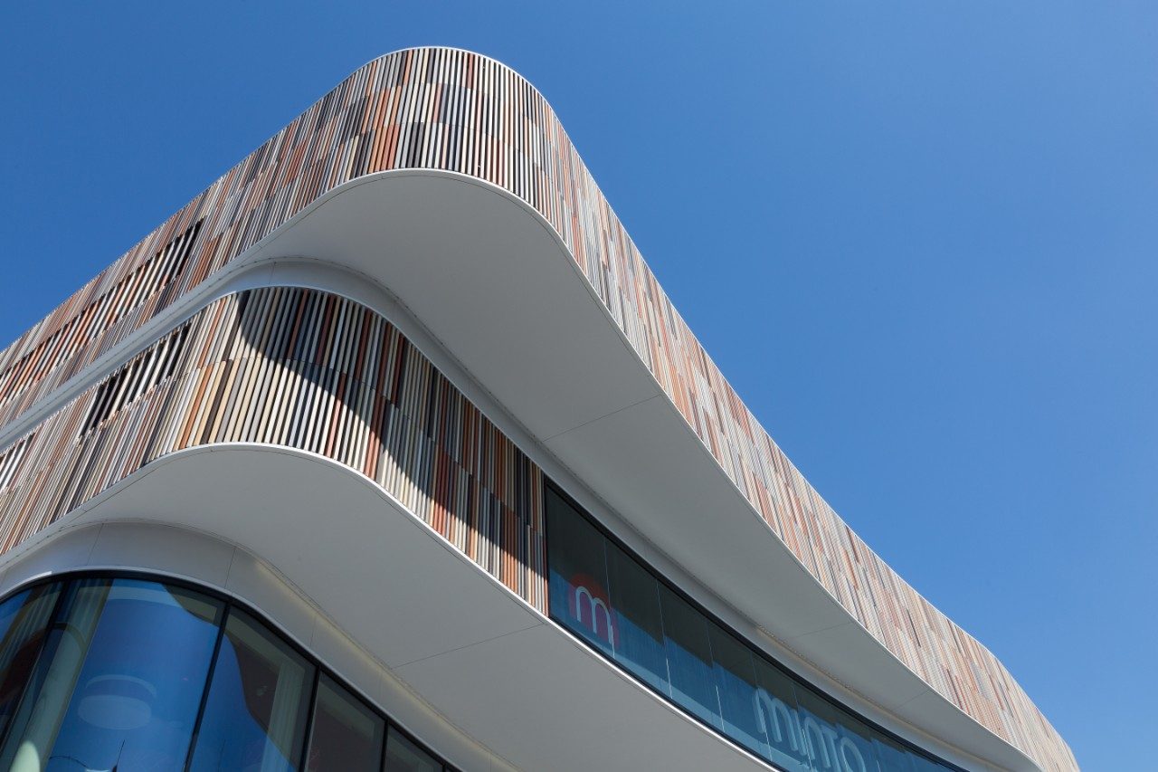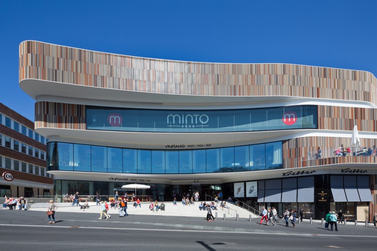 Opened in 2015, the Minto centre’s facade was designed according to the plans of the Aachen office kadawittfeldarchitektur. The building is clad in floor-to-ceiling and inward-curved façade ribbons whose three-dimensional shape reacts differently to the urban surroundings. The soft curves of the vertical lamellar bands draw the attention of passers-by to the entrances, creating terraces and covered open spaces, thus addressing the function of the façade as an interface between the building and the urban space.