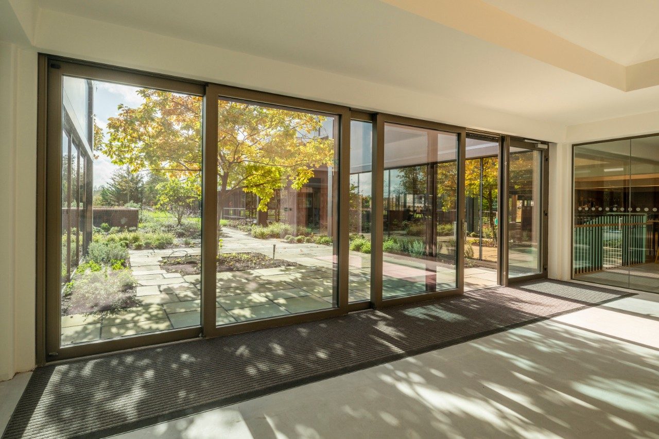 La renovación de Mountbatten House revitalizó una estructura icónica, combinando la eficiencia energética moderna con un atractivo arquitectónico atemporal. La nueva fachada cuenta con vidrio SunGuard™ SunGuard High Performance, elegido por su rico tono bronce y su capacidad para minimizar la ganancia de calor solar a la vez que maximiza la luz natural. Las capacidades de luz natural de la selección de vidrio ayudaron a crear una experiencia de llegada acogedora a la vez que abrían las vistas a las áreas del jardín. Un espectacular vestíbulo de doble altura y una nueva escultural escalera en espiral sirvieron para conectar el segundo y tercer nivel, abriendo e iluminando el interior.