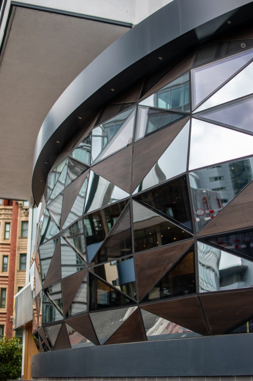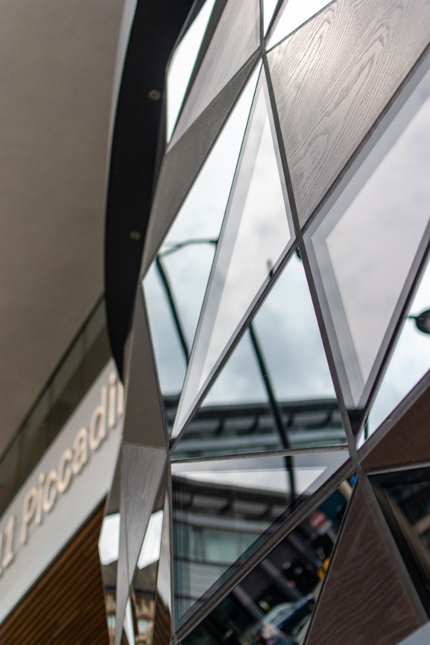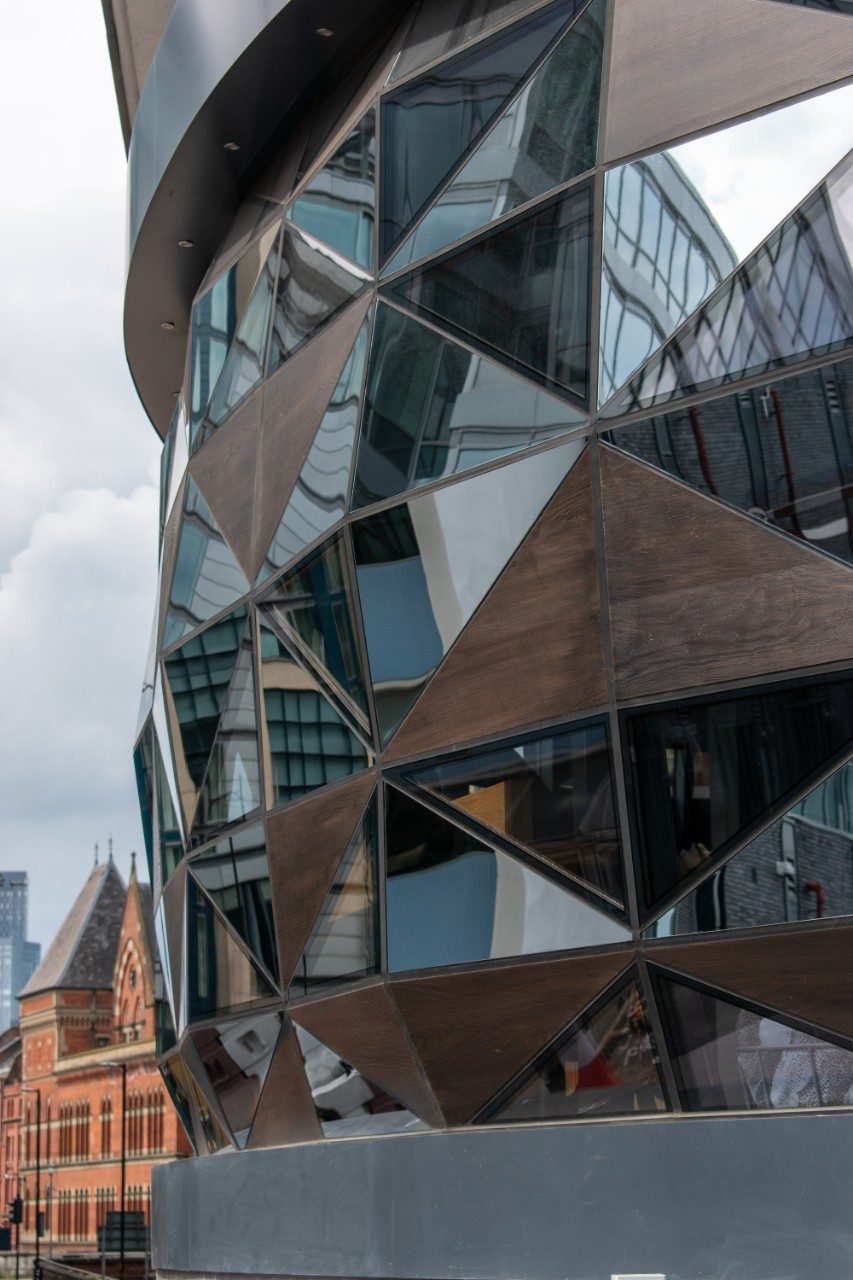 La structure en verre à facettes de The Gem agit comme une surface réfléchissante et utilise une combinaison de verre, d’acier inoxydable et de placage de chêne, ce qui encourage une abondance de lumière naturelle dans les espaces intérieurs.