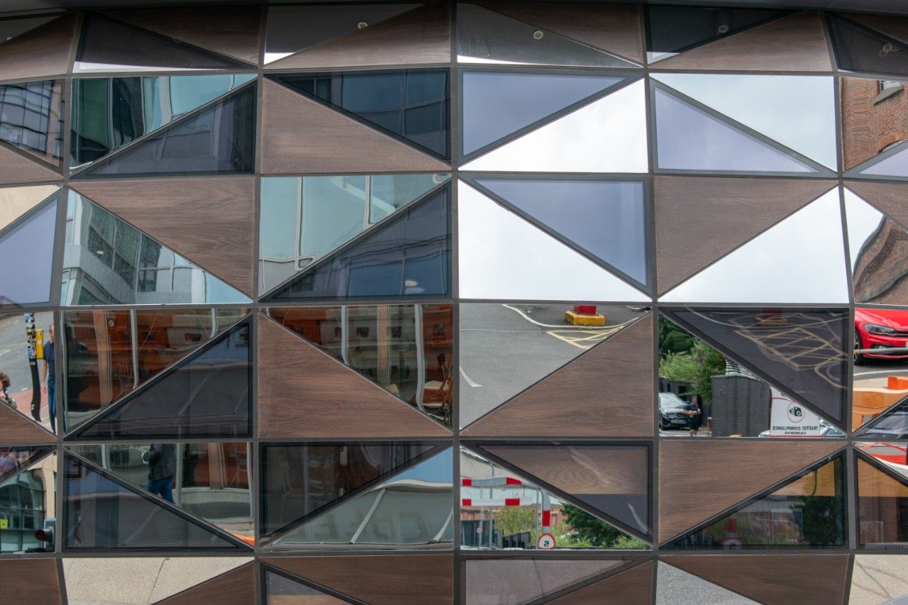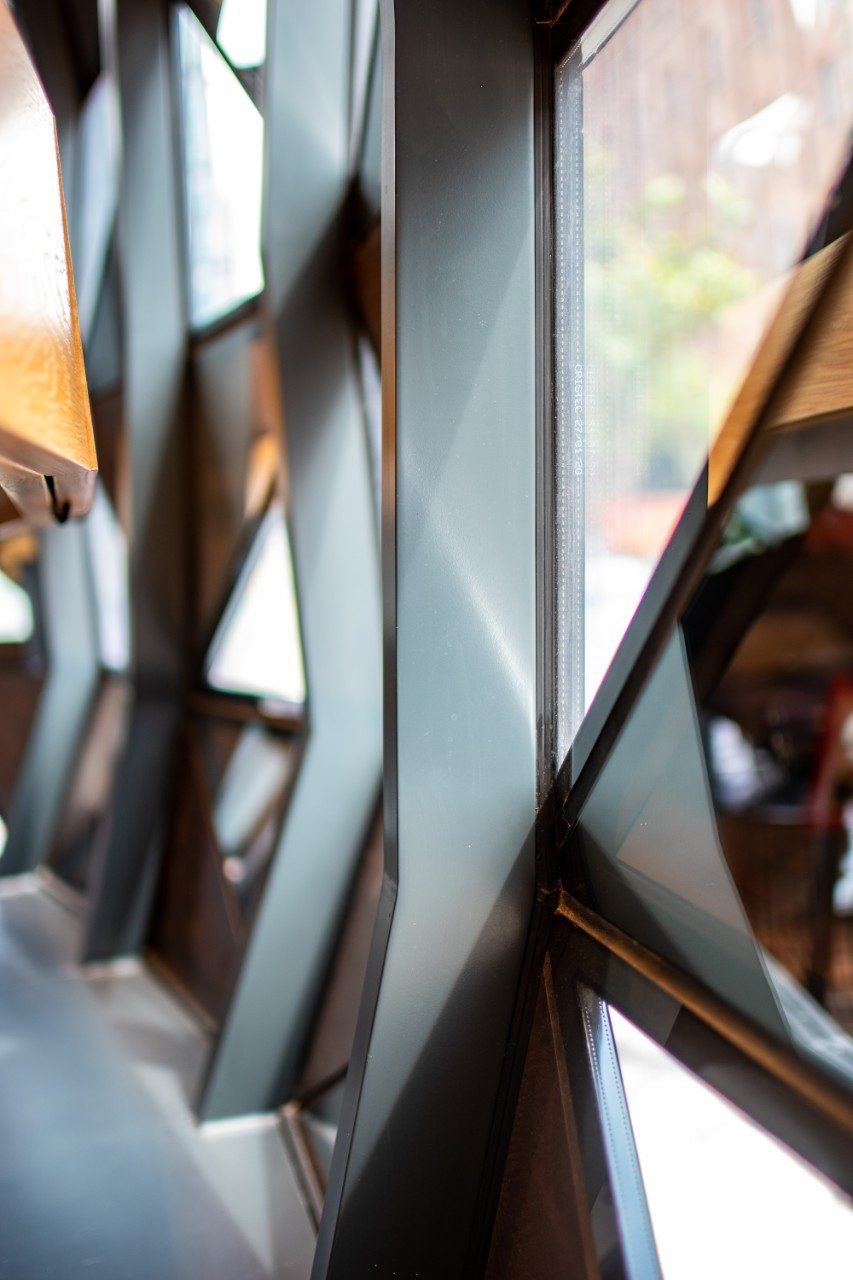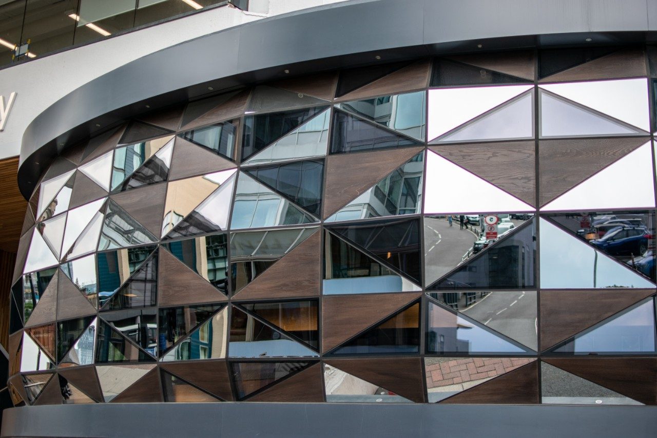La structure en verre à facettes de The Gem agit comme une surface réfléchissante et utilise une combinaison de verre, d’acier inoxydable et de placage de chêne, ce qui encourage une abondance de lumière naturelle dans les espaces intérieurs.