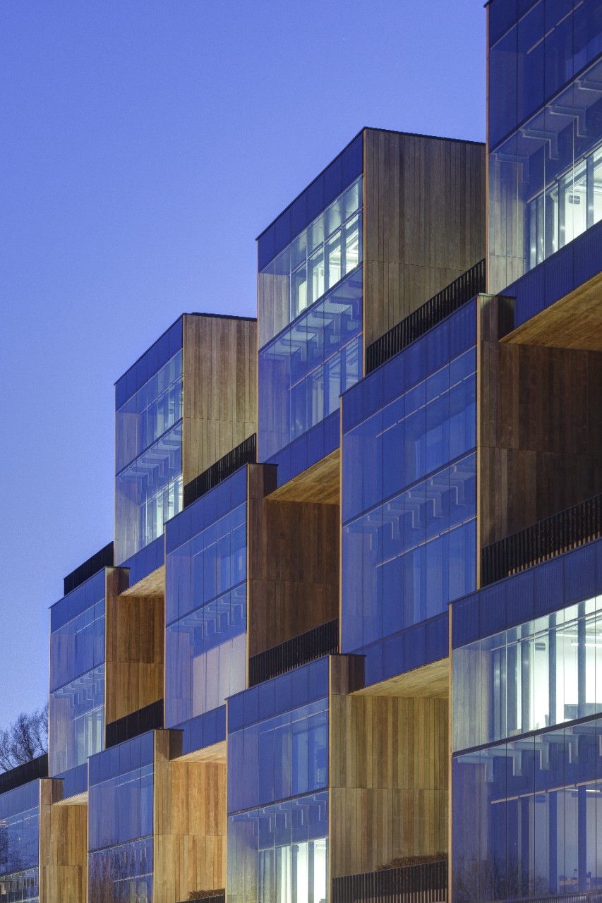 Gli insoliti esterni in vetro dell'edificio presentano due lati completamente diversi. Mentre il lato a nord dell'edificio è semplice, liscio e raffinato, la parte a sud è costituita da cubi disposti nello spazio in modo tale da formare una specie di scacchiera. Lo spazio tra i cubi è riempito con diversi elementi vegetali e lignei che, combinati con un enorme giardino pensile, conferiscono all'edificio un tocco veramente ecologico.