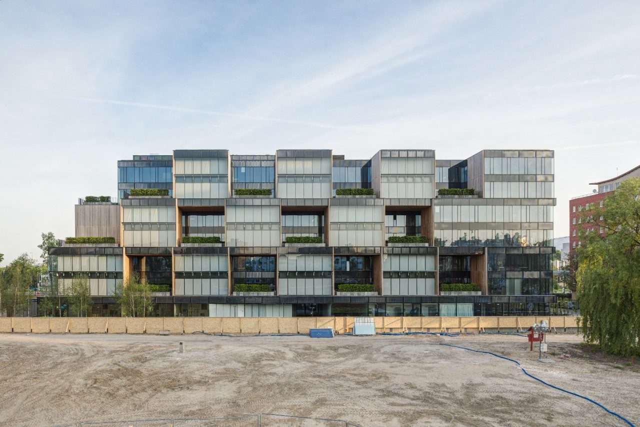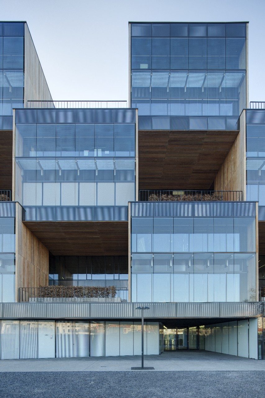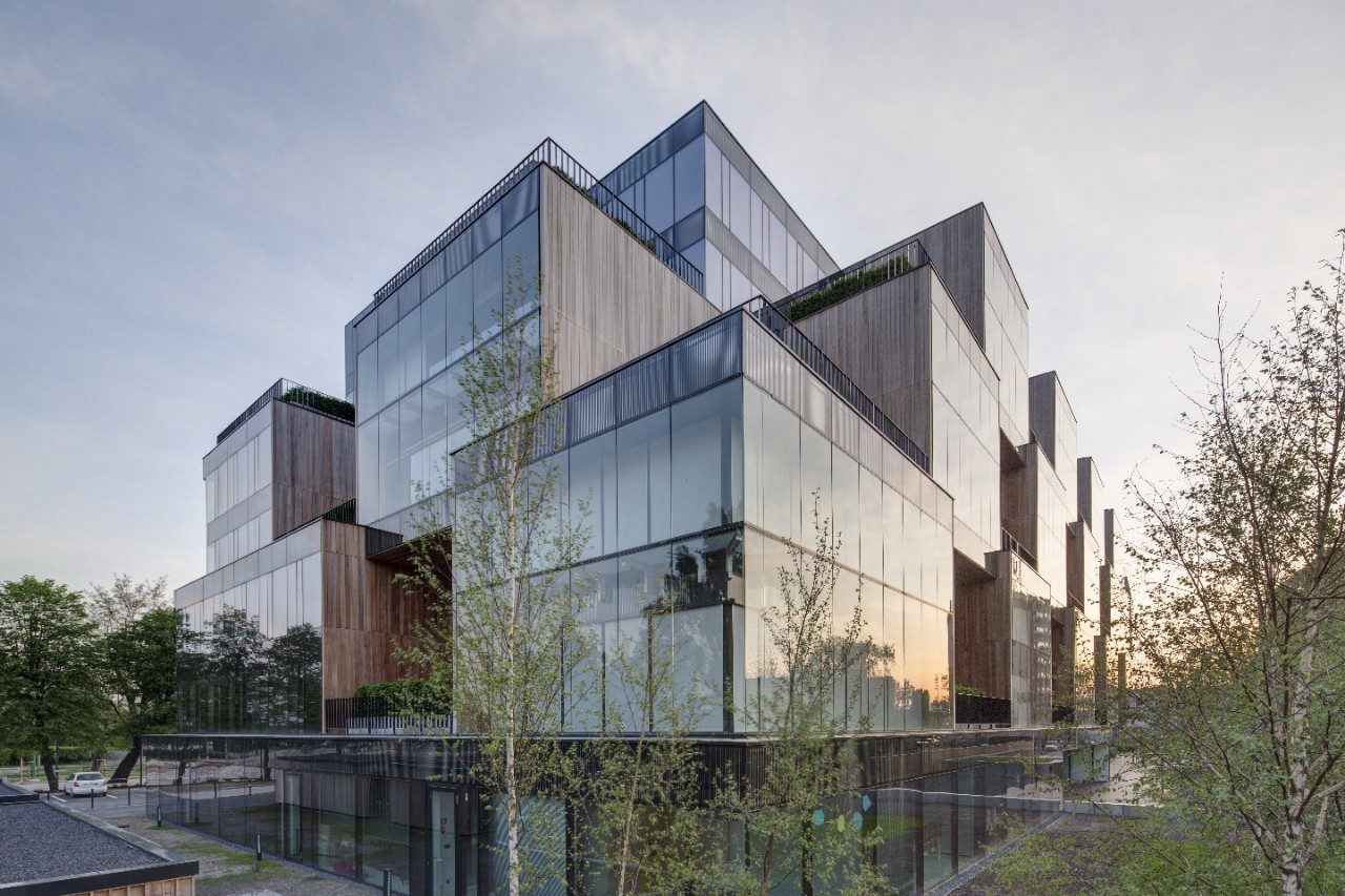 Exteriorul neobișnuit din sticlă al clădirii are două laturi distincte. În timp ce latura nordică a clădirii este simplă, netedă și discretă, cea sudică este formată din cuburi dispuse spațial, care formează un fel de tablă de șah. Spațiul dintre cuburi este umplut cu vegetație diversă și elemente din lemn, care, combinate cu o grădină imensă pe acoperiș, dau clădirii un aspect cu adevărat ecologic.