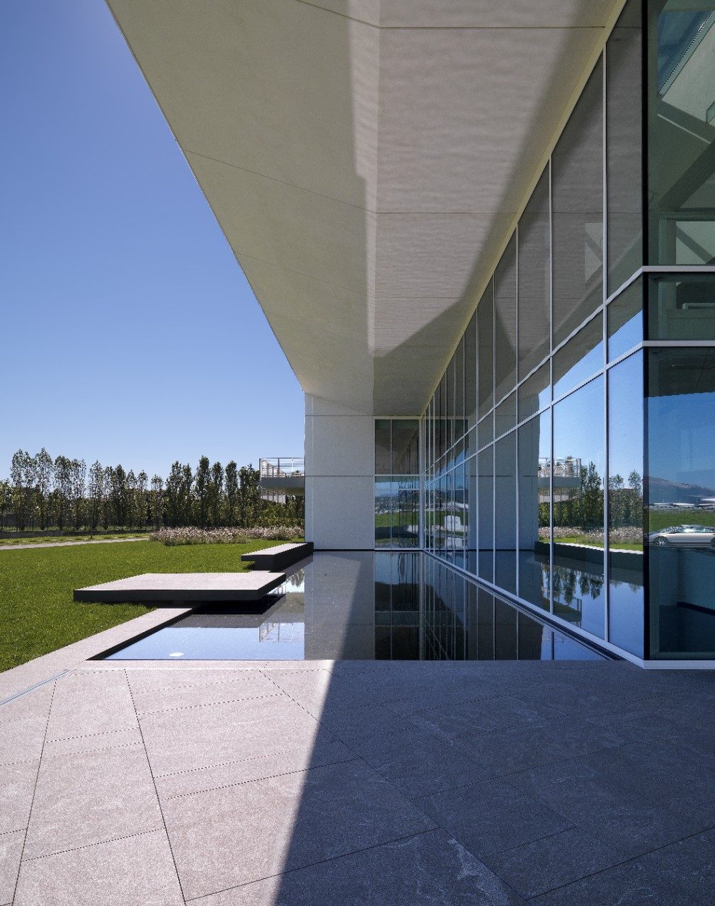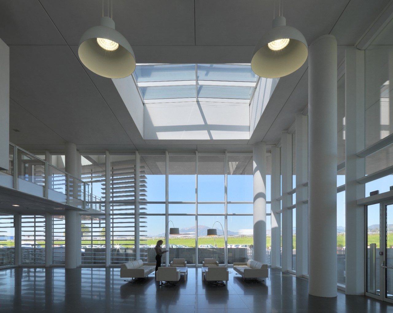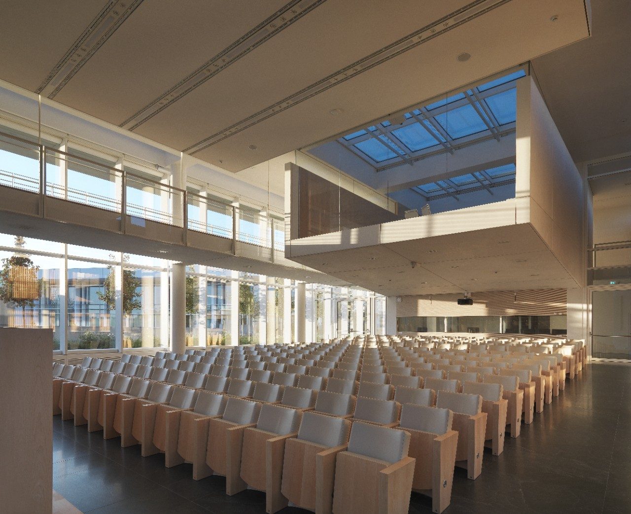 The V-shaped laboratory building is divided into public and private areas that surround a central courtyard. Those separate wings hinge on a double height entrance foyer, within which a long, elegant ramp allows circulation between floors.