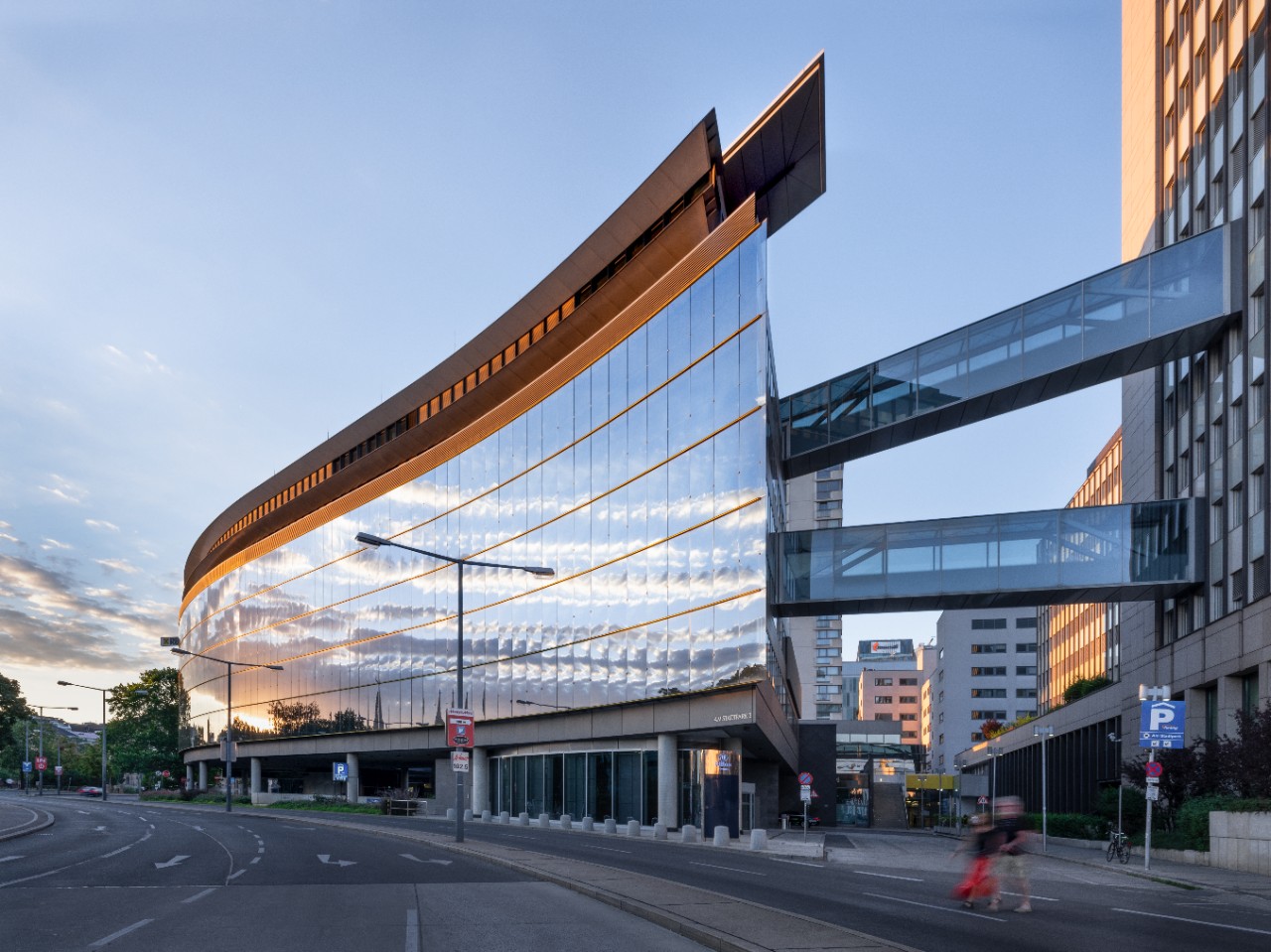 The seven-storey building looks like it is floating above the streets thanks to its S shape and its appealing blue façade, made with Guardian SunGuard® Solar Royal Blue 20 coated glass - the predecessor of SunGuard® High Durable Royal Blue 20. The third and seventh floors connect Die Welle to the main Raiffeisen Zentralbank building through two glass bridges.