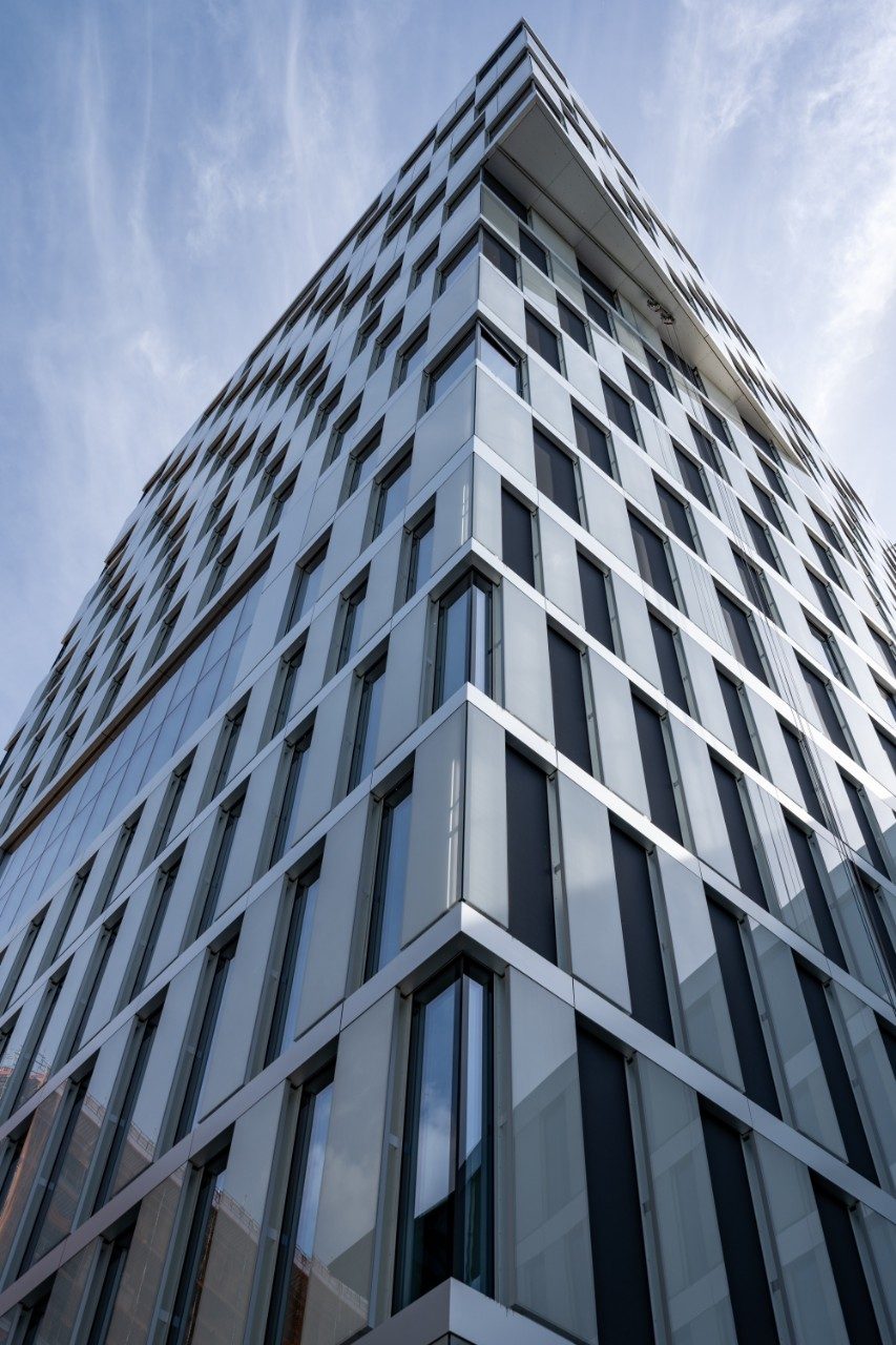 Two glass types were chosen for the glazed façades: Guardian SunGuard® SuperNeutral® (SN) 62/34 coated solar control glass, which minimizes the need for artificial light, offers excellent sun protection, and outstanding thermal insulation. Guardian ClimaGuard® Premium2 laminated acoustic and thermal insulation glass was also chosen. For the cafeteria area, eyrise® instant solar shading windows were installed. This solution adapts its shade to the change of sunlight to help prevent overheating, as well as bothersome glare.