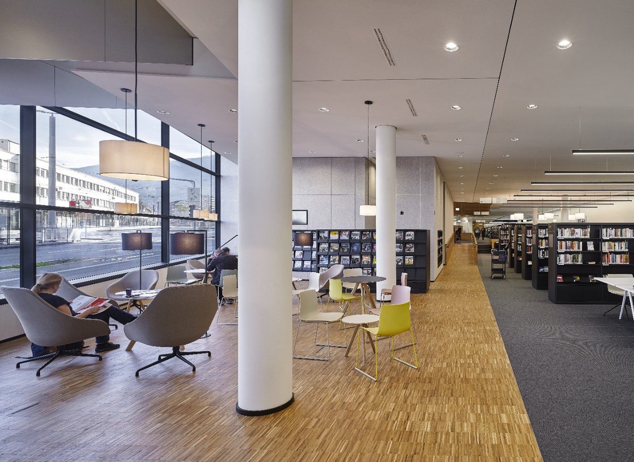 The design of P2 combines a range of functions within a consciously architectural and yet spatially restricted building. P2 consists of a two-storey base building – which accommodates the new City Library – topped with an eleven-storey disc-shaped tower that houses 173 student apartments. One floor between the base and tower is open to the public, acting as a cultural platform. There is also a public space on the roof that offers additional space for restaurants.