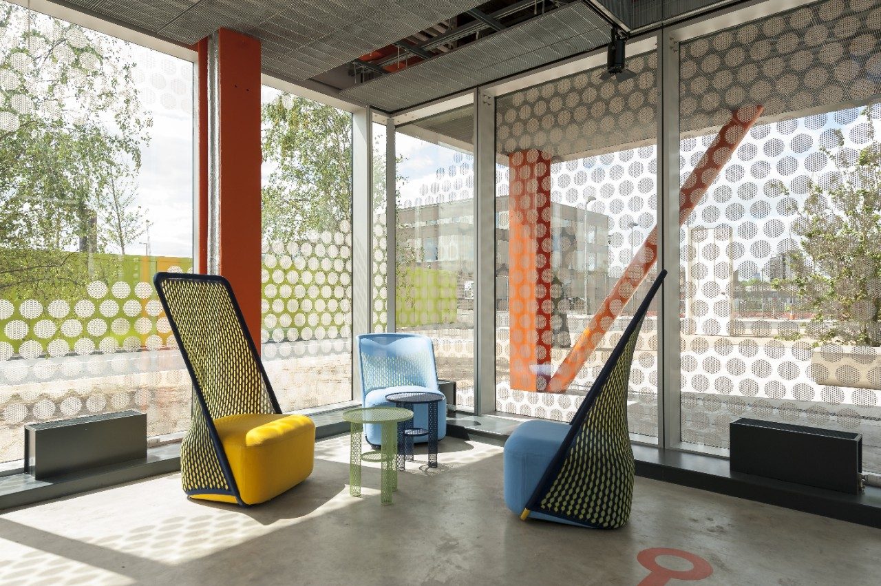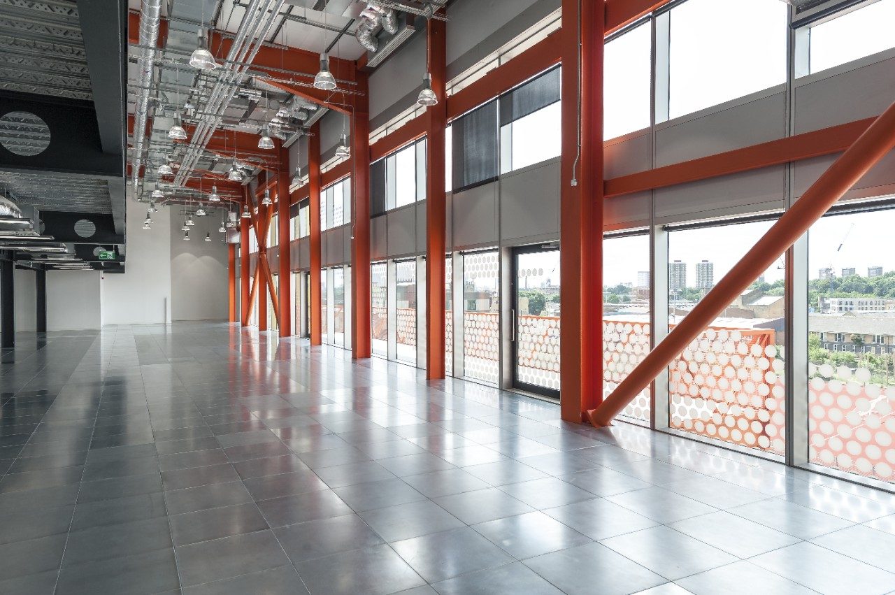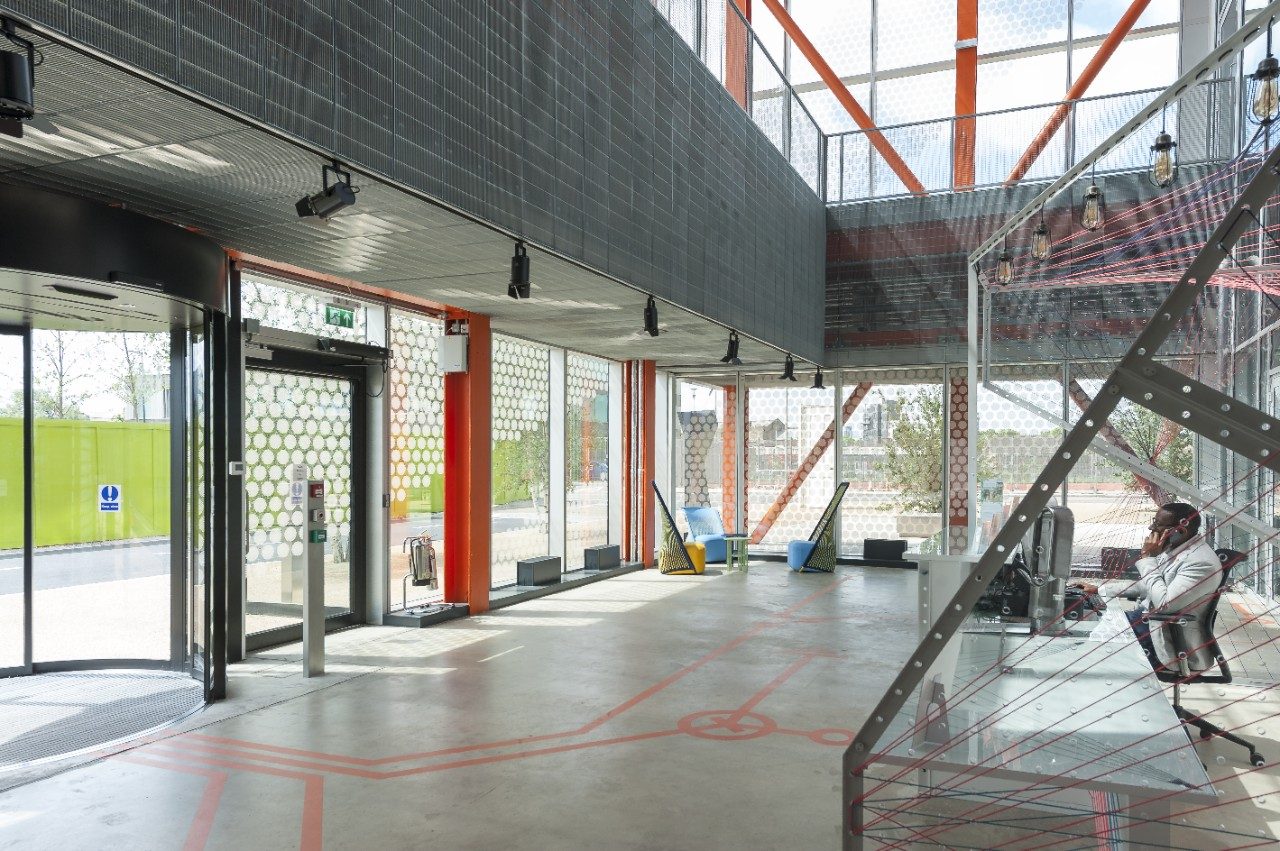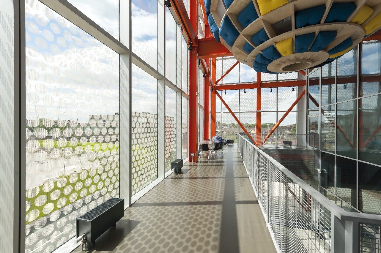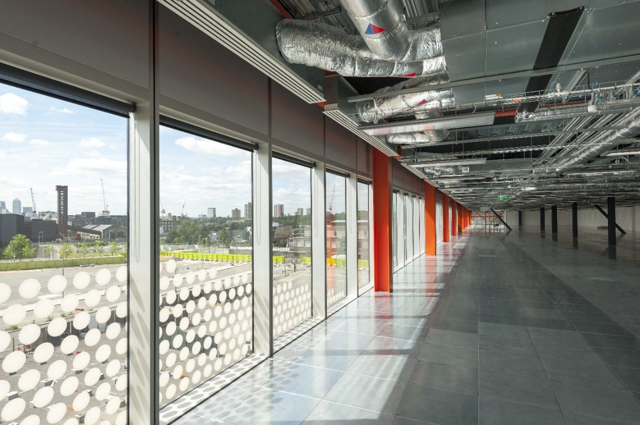 El esmerado diseño del Here East Broadcast Centre de Londres amplía la visibilidad entre todas las áreas del edificio, a la vez que presta especial atención a la calidad y el rendimiento de la acústica, la ventilación, la iluminación y el rendimiento térmico.