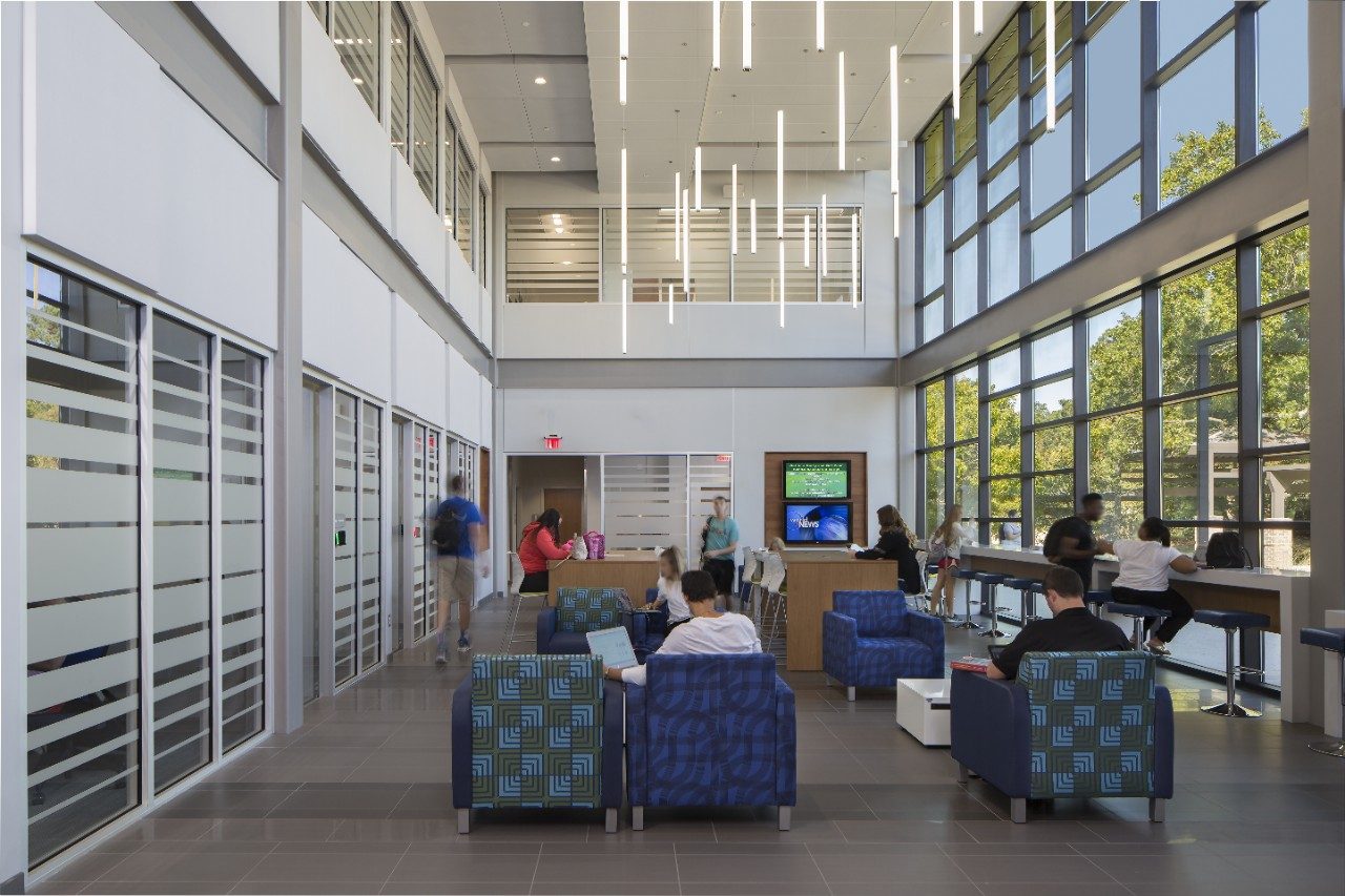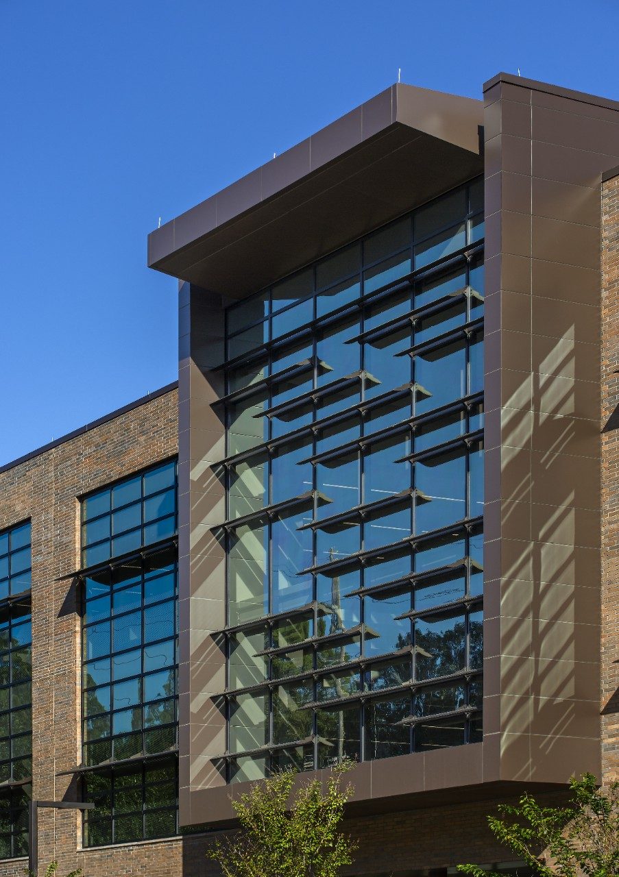 Una nueva instalación de tres pisos de vanguardia diseñada por Quackenbush Architects + Planners. El vidrio transparente SunGuard® SuperNeutral® 54 ayuda a crear el punto focal del campus de Beltline en Rosewood Drive, con aulas y laboratorios informáticos con una gran cantidad de tecnología.