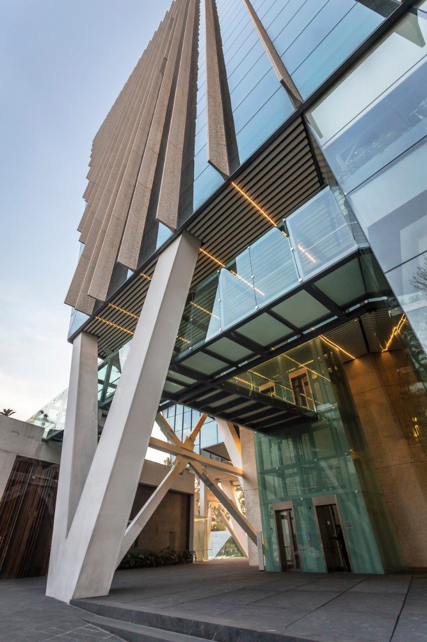 El rascacielos con forma trapezoidal invertido está revestido con Guardian SunGuard® Royal Blue 40 y SNR 43 en vidrio recubierto de control solar Crystal Gray que ofrece una estética perfecta y un alto rendimiento energético en todos los espacios del edificio.