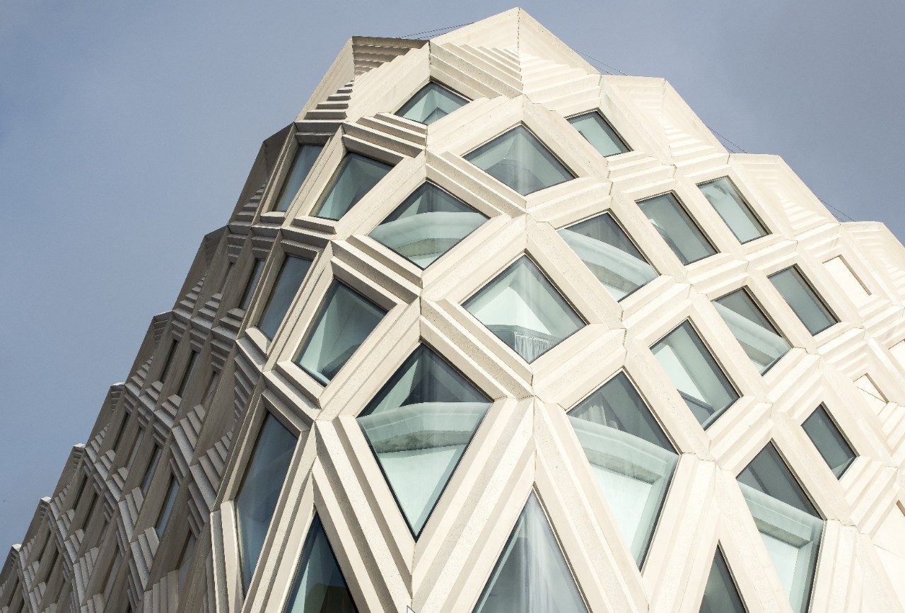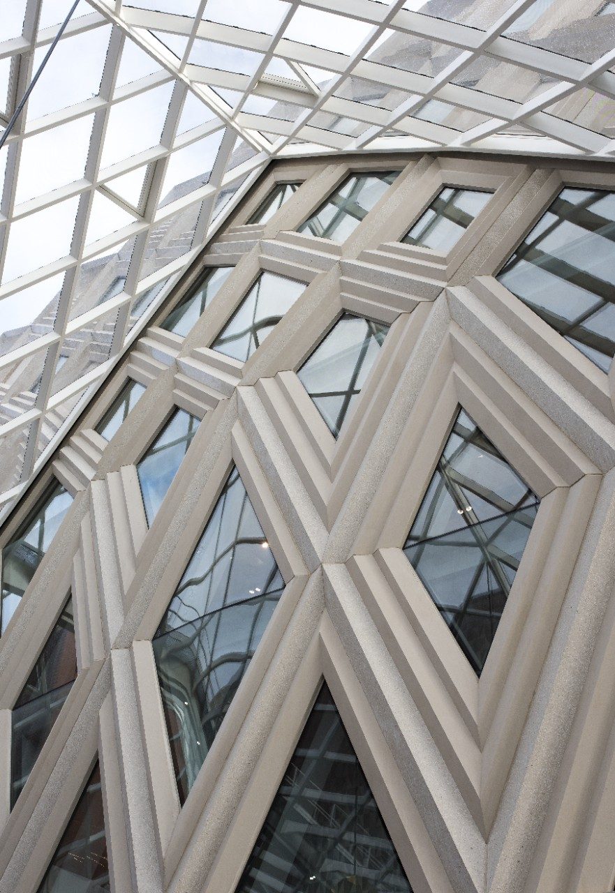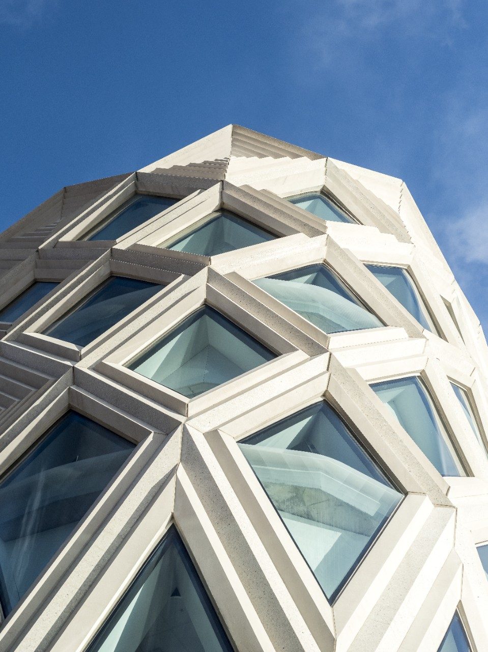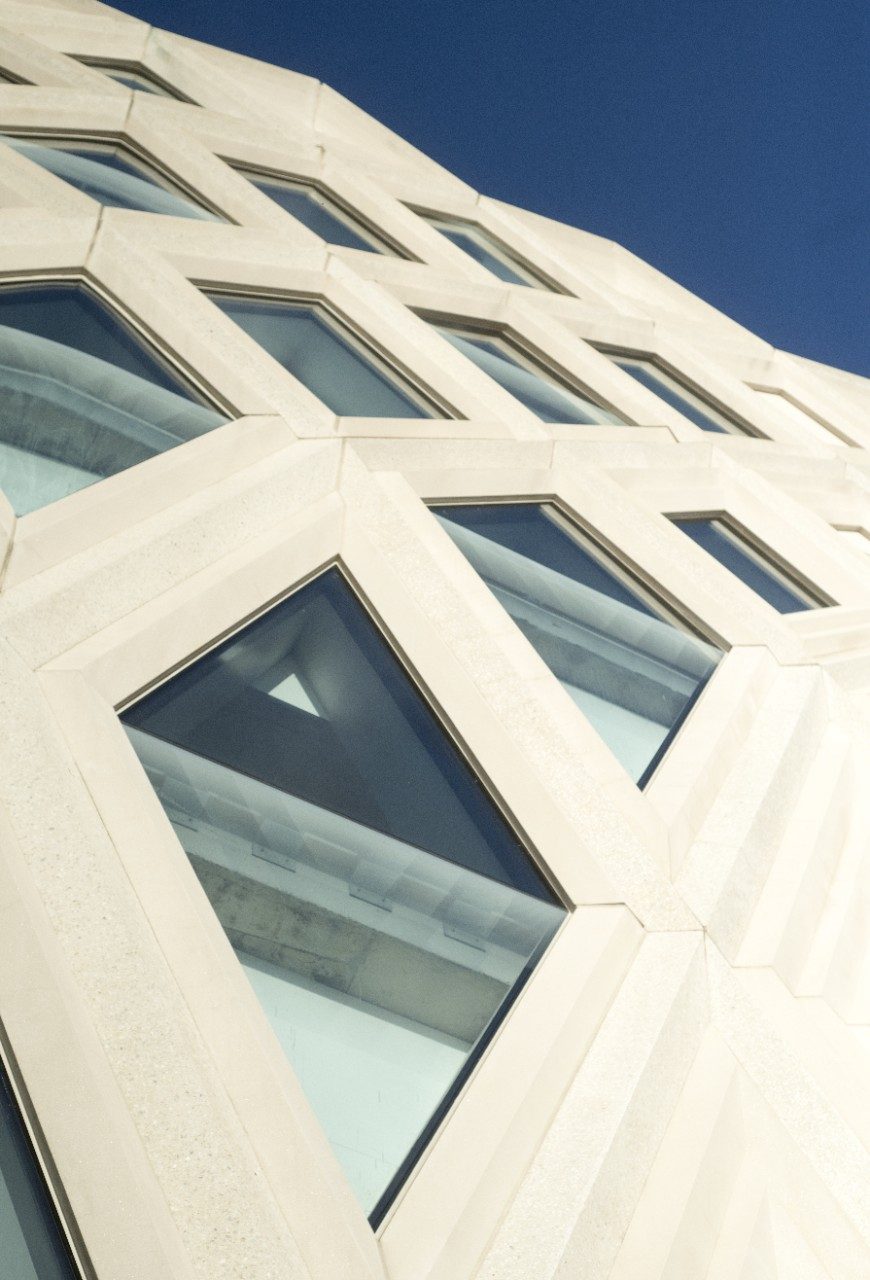 La fachada, con un patrón de rejilla, está hecha de puntales de hormigón grabado y está perforada por una serie de ventanas de vidrio revestido Guardian SunGuard® SuperNeutral™ 70/35 que añaden un sentido único de orden y ritmo a la misma. El color azul natural del vidrio SN 70/35 funciona a la perfección con los tonos sutiles del hormigón, a la vez que inunda de luz natural el espacio de la arcada.
